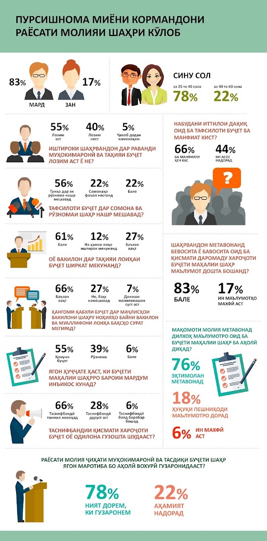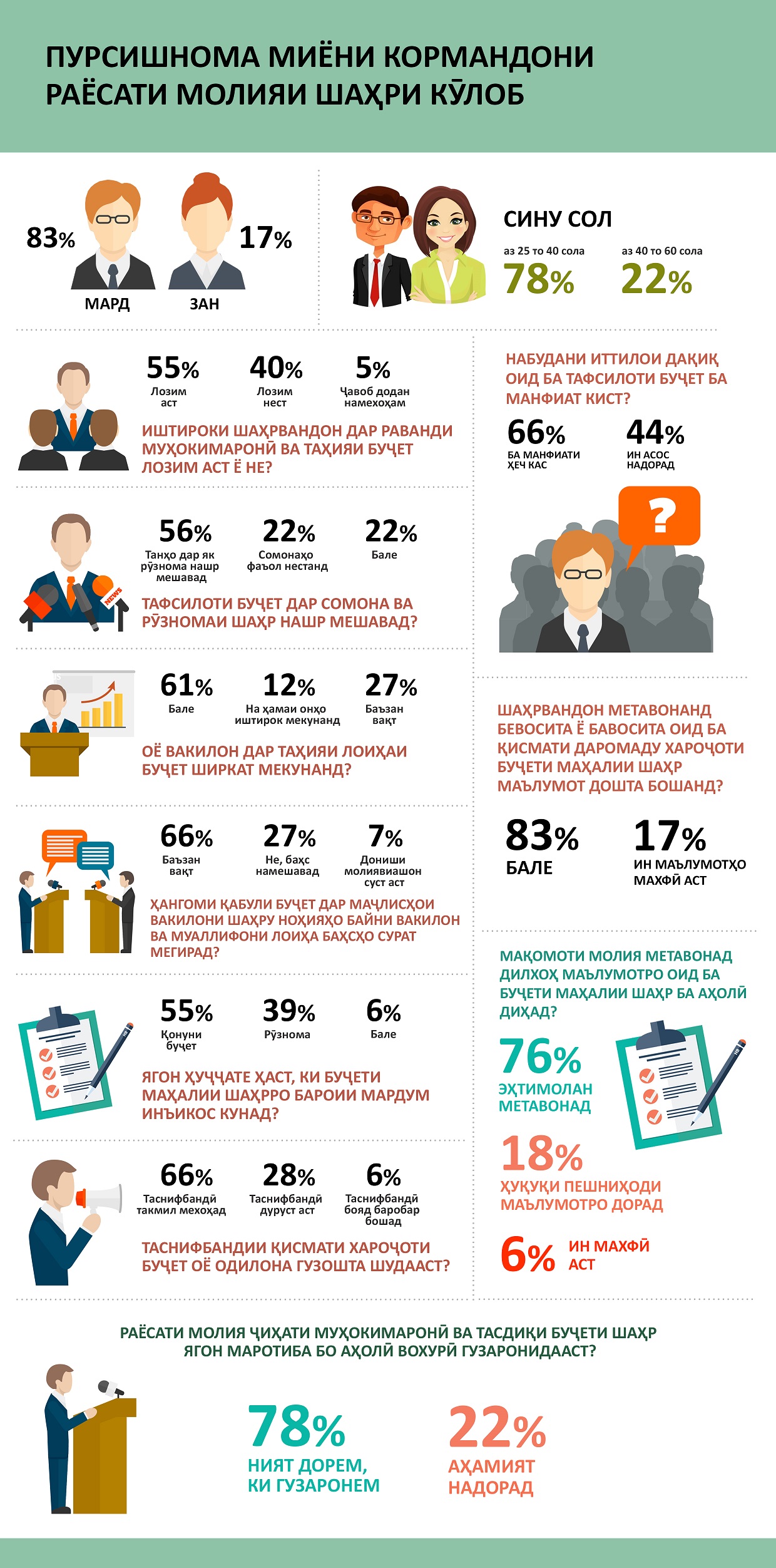 Ҷиҳати то кадом дараҷа шаффоф будани буҷаи маҳаллии шаҳр дар байни аҳолӣ пурсишномае гузаронидем. Натиҷаҳои ин пурсишномаро дар тасвирбаёни зер мушоҳида кунед: